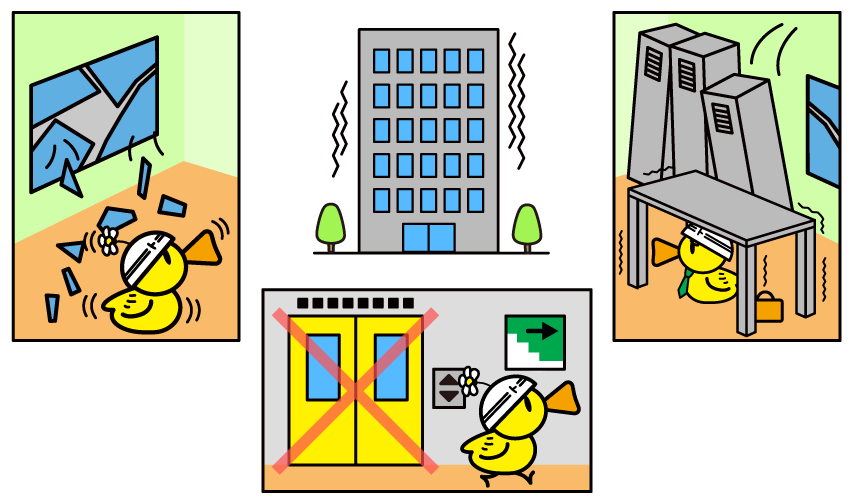 高いビルからすぐに出ることは大変危険です。外へ避難(※1)しようとせず、頭を保護し、倒れるもののない場所で揺れがおさまるのを待ちましょう。大きなキャビネットやガラス窓などから離れましょう。