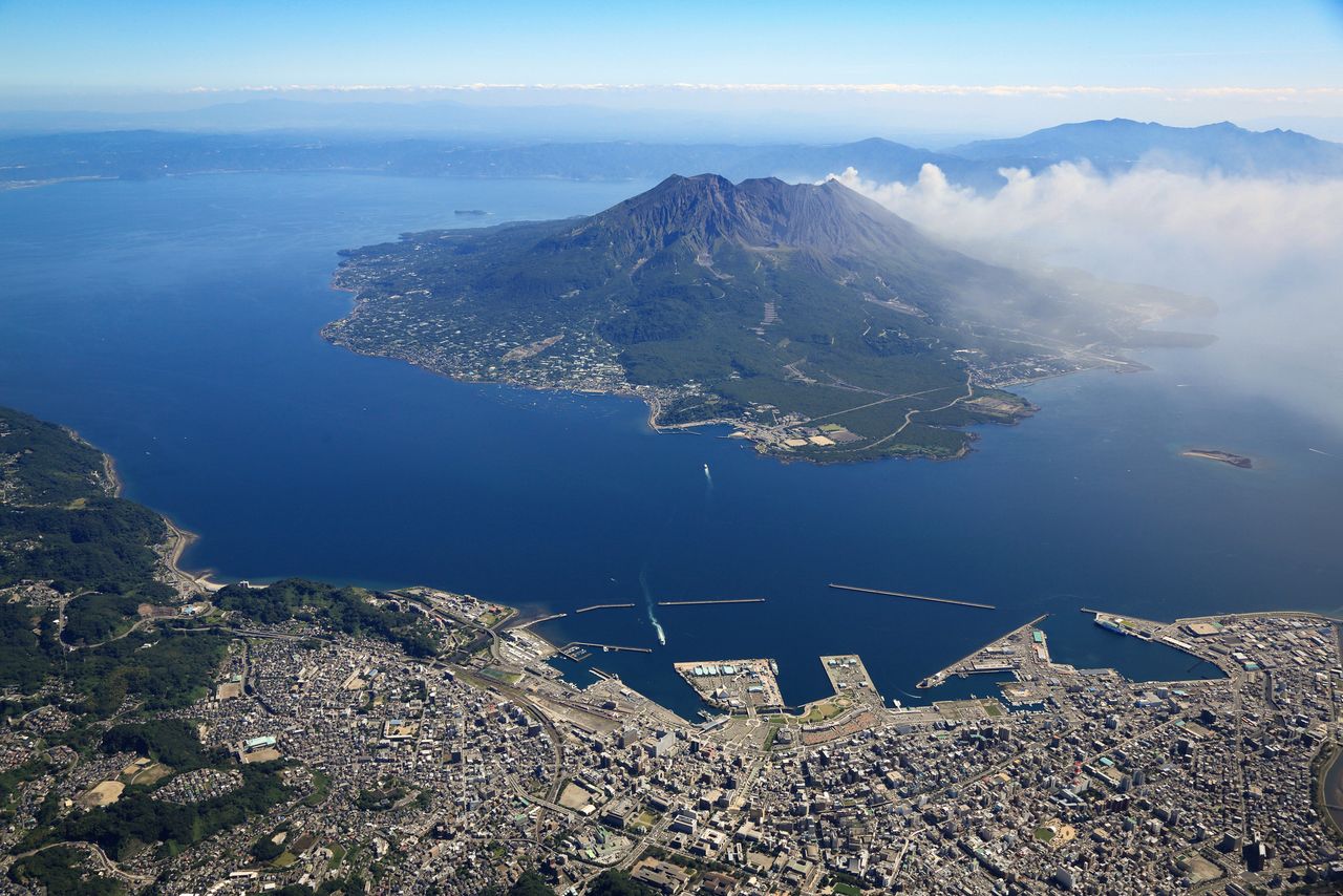 上空から見た錦江湾に浮かぶ桜島と鹿児島市の沿岸部 © K.P.V.B