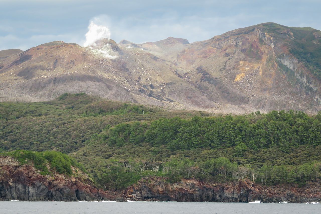海上から浸食崖の向こうに、噴煙を上げる新岳を望む 写真:PIXTA