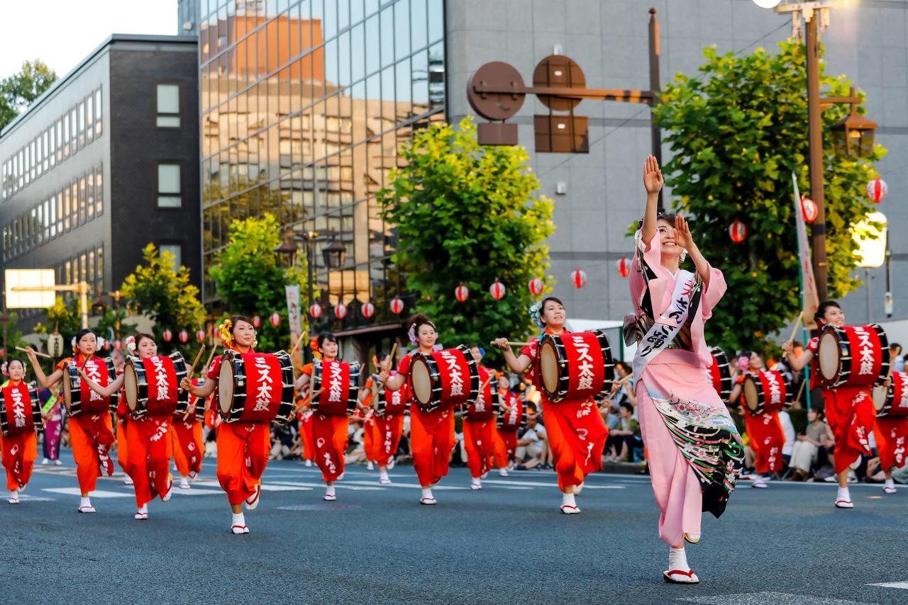 腰帯を巻いた浴衣姿の「ミスさんさ踊り」5人が華やかに先導し、大通りいっぱいに広がった太鼓隊が、「サッコラ、チョイワヤッセ」と高らかな掛け声を上げる。大群衆が一体となるパレードは、例年110万人を超える観客を圧倒する。