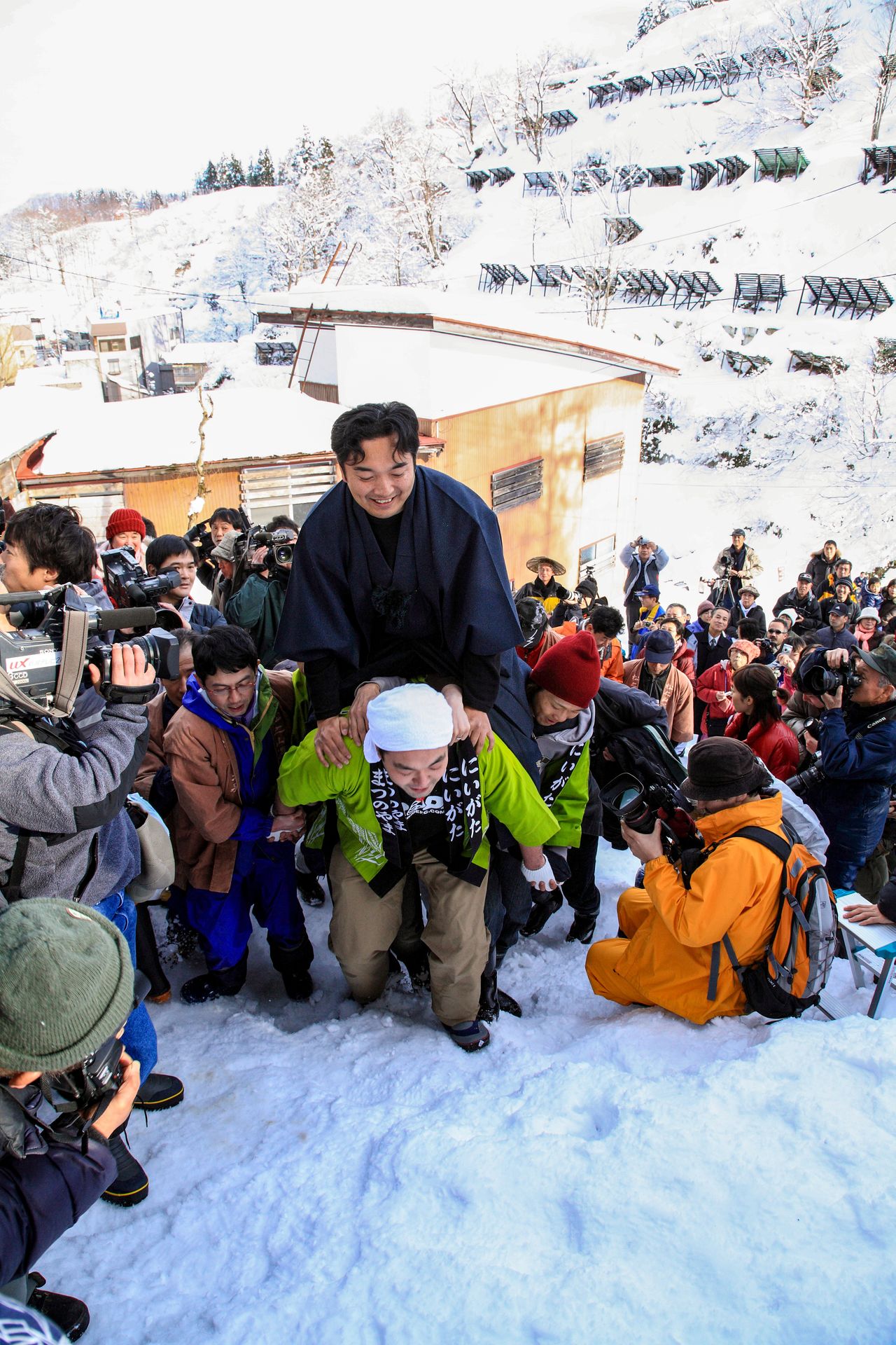 新潟県南西部の豪雪地帯、十日町市松之山の「むこ投げ」は、新婚男性を雪山の急坂に放り投げて落とす、実にユニークな祝いの行事。その昔、集落の娘をめとった他村の男が、初めて嫁の実家に泊まった。「村の大切な娘を奪ったな、けしからん」とやっかんだ地元の男らが、婿を捕まえて雪の中に放り投げたのが始まりとされる。