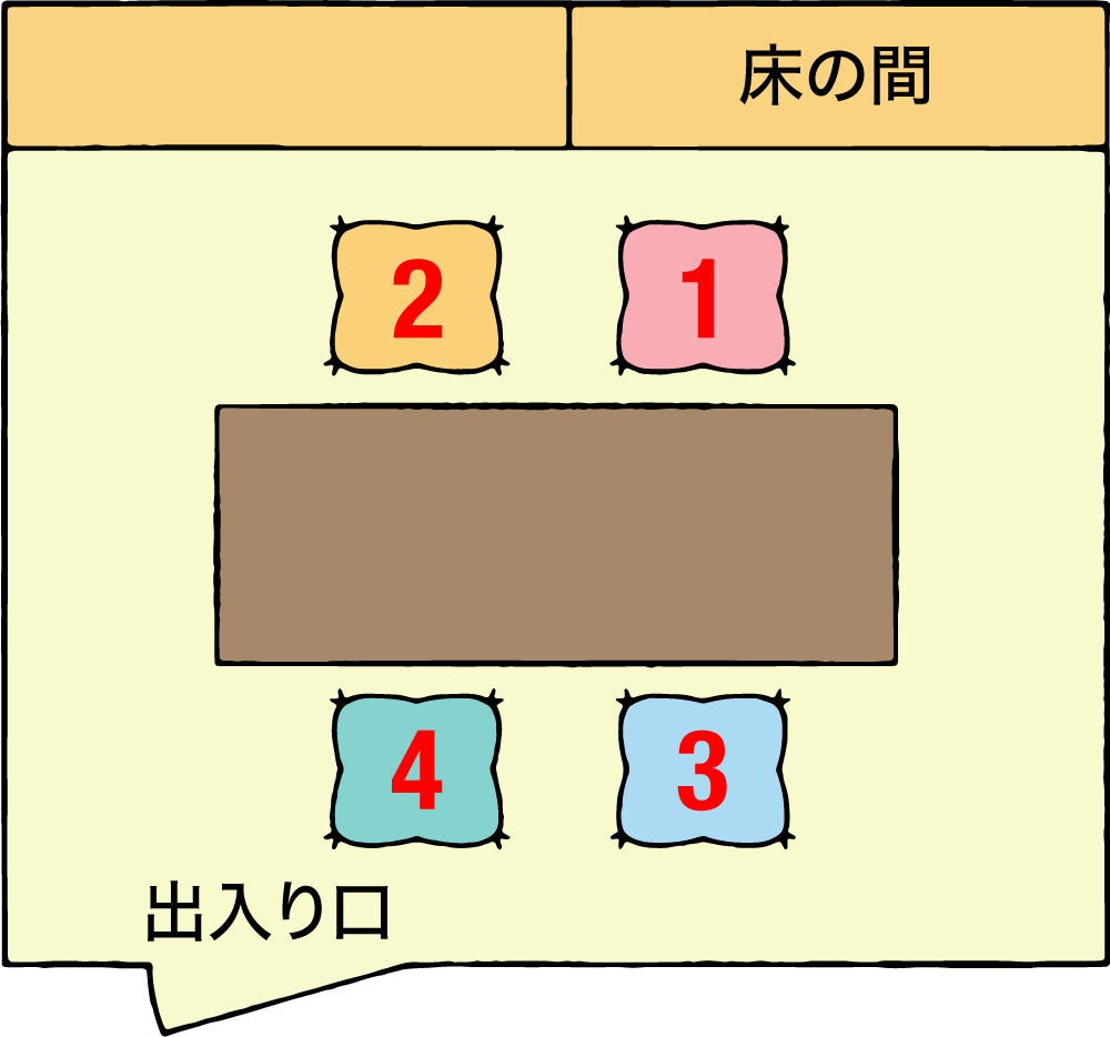 和室・洋室に関わらず部屋の一番奥が上座、出入り口に近いのが下座。茶菓を運んだり、ビジネスシーンであれば資料のコピーを取りに行ったりと、出入りするのは下っ端の役目。飲食店では店員を呼び止めて注文しやすい。