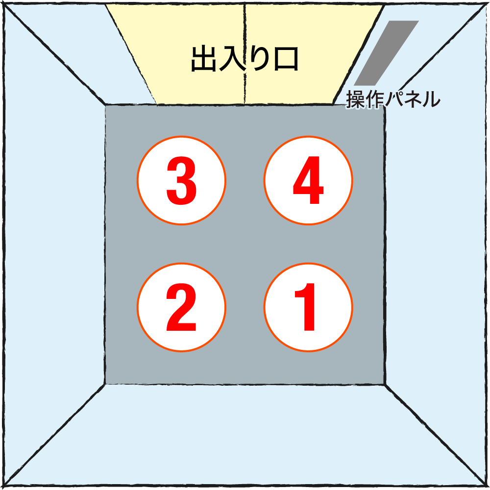 乗る人数が多いと原則通りにも行かないので、「上座は右奥、下座は操作盤の前」とだけ覚えておけば十分だろう。