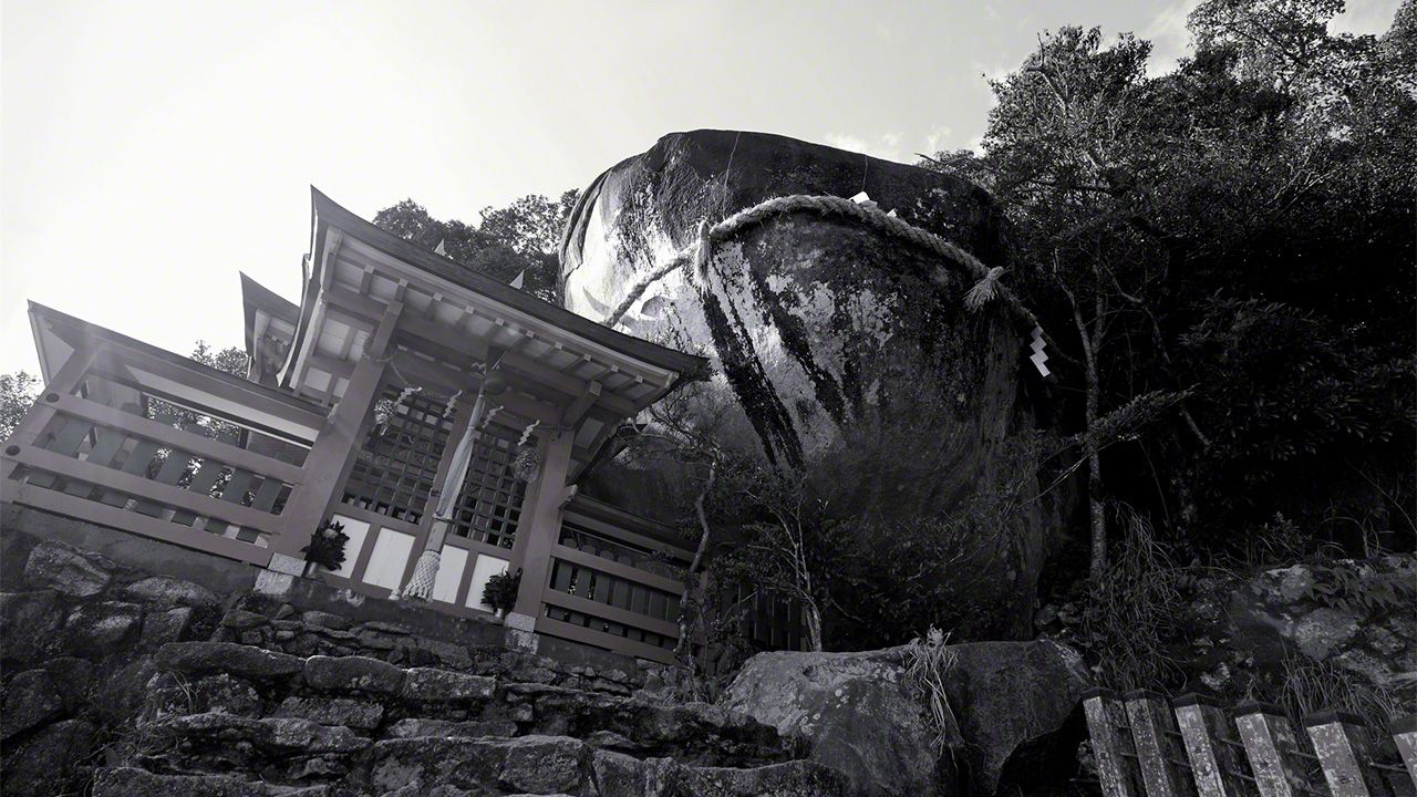 ゴトビキ岩は100メートルほどの断崖の上にあり、麓の大鳥居から源頼朝が寄進したと伝わる石段が延び、たどり着くには538段の急勾配を登らなくてはならない。不揃いな自然石が積み上げられただけで手すりもなく、踏み外して落ちないように足元を確かめながら進む。登り切ると、朱塗りの社殿と重なり合ってそびえ立つゴトビキ岩が現れる。ゴトビキとはこの地方の方言でヒキガエルを意味するそうだ。確かに、どっしりと構えた巨大なヒキガエルが座しているようにも見えた。崖にぐいとせり出して今にも転がり落ちそうな巨岩を目の前にすると、拝まずにはいられない迫力がある。古来、人々はこの岩を仰ぎ見ることで神を感じてきたのだろう。
