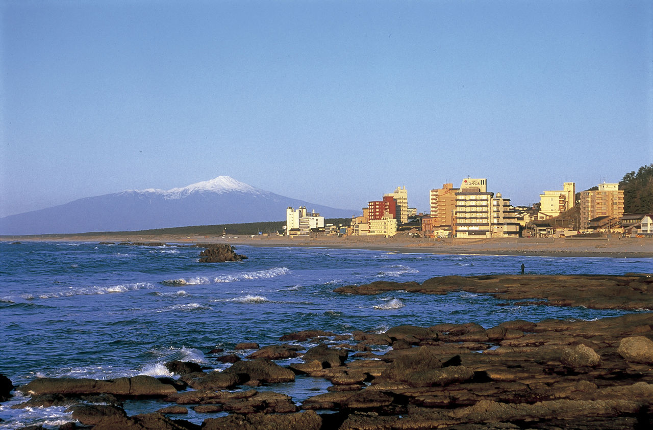 加茂水族館からバスで走ること約10分、弓なりの広い砂浜「湯野浜海岸(ゆのはまかいがん)」に到着する。「日本最古の波乗りの地」として江戸時代の文献にも記されている海岸で、現在もサーファーや海水浴客でにぎわう。山容が富士山に似ていることから「出羽富士」と呼ばれる鳥海山(ちょうかいざん)を遠望する絶景スポットで、夕日の名所としても知られる。海岸の目の前には、奥羽三楽郷の一つとして知られる湯野浜温泉の温泉街が広がる。