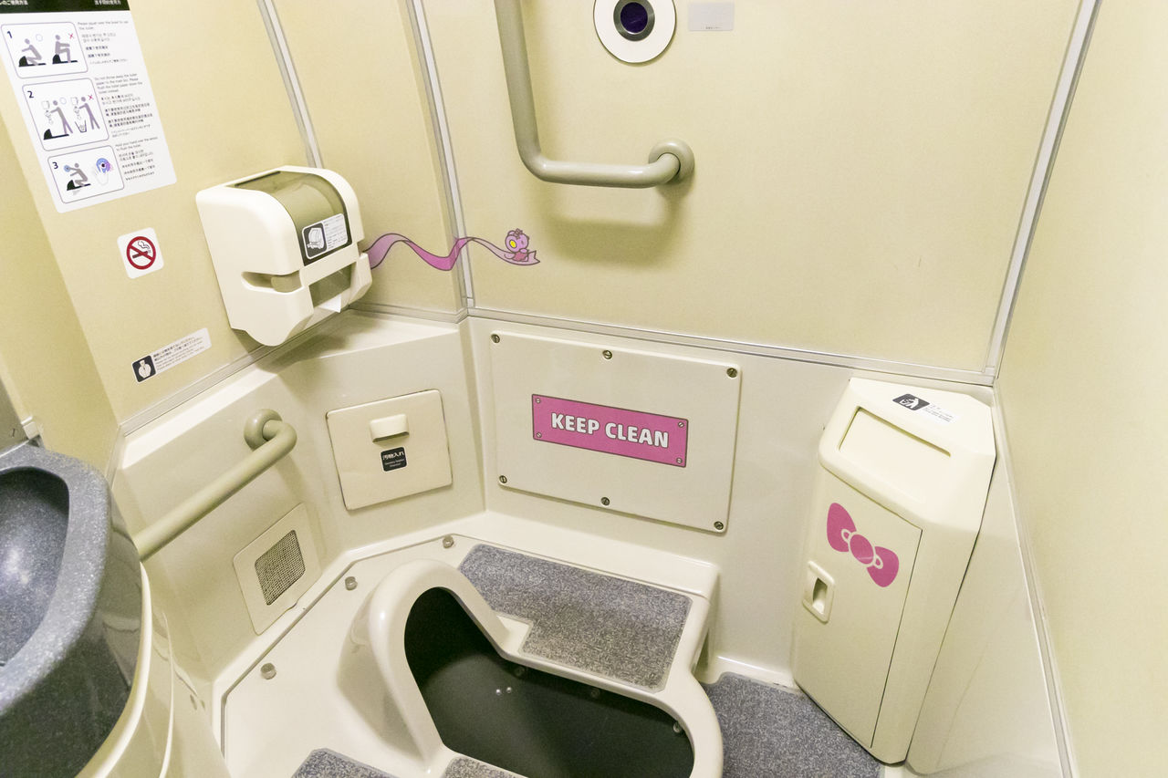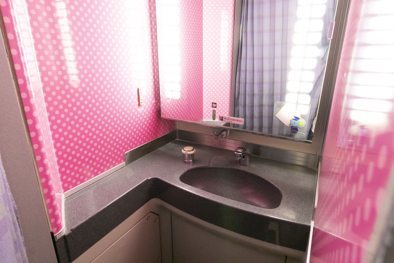 1号車と2号車の内装もキティワールドが全開。座席や壁面だけでなく、床やテーブル、トイレなど至る所にハローキティがあしらわれている。1号車は西日本の各地域の魅力を発信する展示スペース「HELLO! PLAZA」で、モニターからは観光情報が流れ、各地域の名産品やグッズの販売などが行われる。2号車の「KAWAII! ROOM」は自由席の車両で、座席のひじ掛けや窓枠などにハローキティがデザインされ、ファンにはうれしいフォトスポットも用意されている。車両は8両編成で、3~8号車は通常仕様の内装となるが、どこかにハローキティのイラストが隠されているらしい。