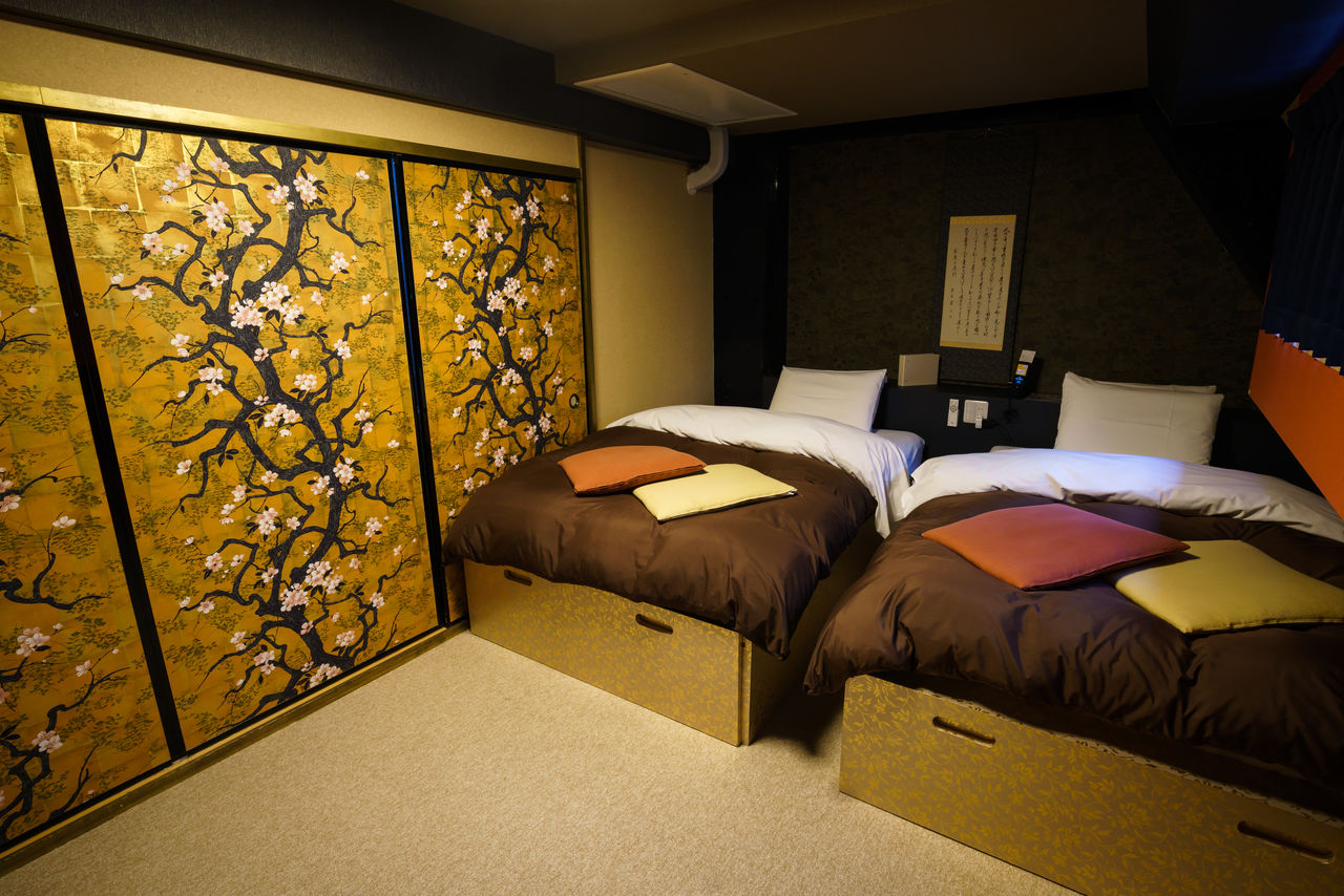 4階は唯一のトリプルルーム。城の内装をイメージしたこの部屋だけは、専用のシャワーとトイレが付いている。桜が描かれた金の襖(ふすま)は、まるで金碧障屛(しょうへい)画のよう。金色のベッドとの相乗効果で、部屋全体にゴージャスな印象を与え、滞在中は城主気分が味わえそうだ。