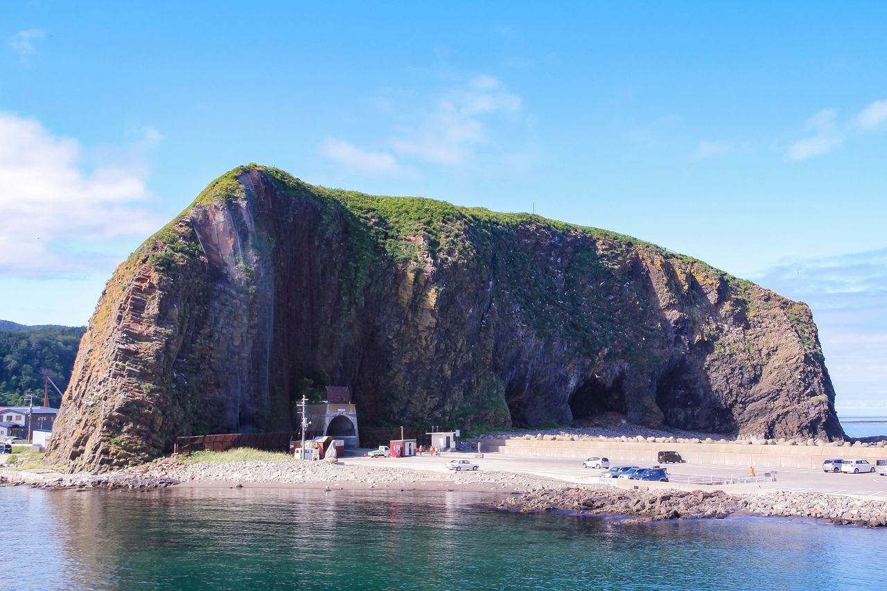 ウトロ港の近くにある岩で、まるで山のように大きい「オロンコ岩」。高さは約60メートルで、約170段の階段を上った頂上からは、ウトロの町並みや知床連山を見渡すことができる。海側の岩壁はカモメなどの繁殖地となっている。