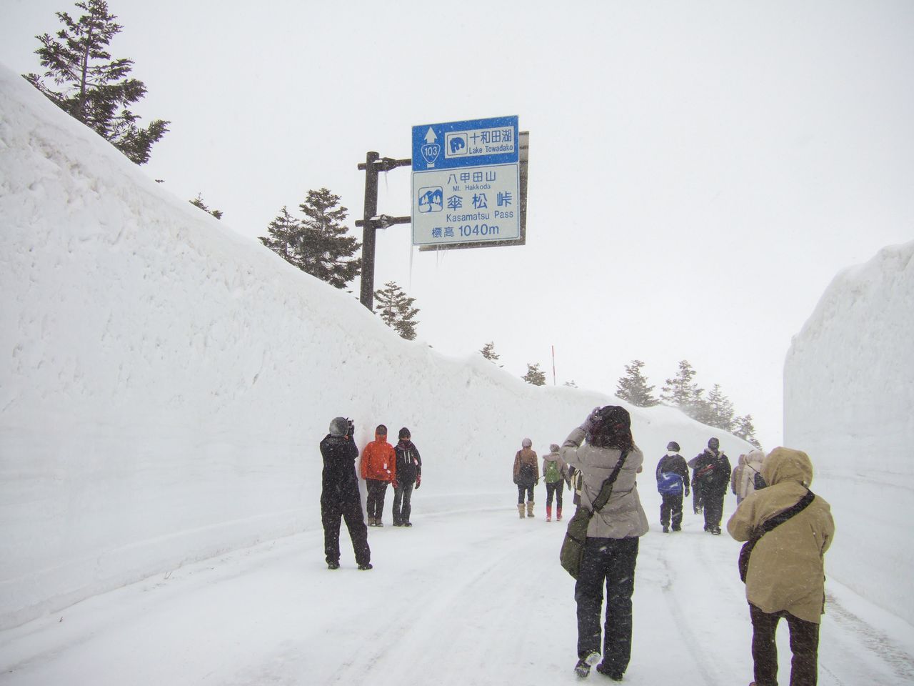 雪の大回廊を歩く「八甲田“雪の回廊と温泉”ウォーク」。冬季閉鎖となっている八甲田・十和田ゴールドラインの酸ヶ湯~谷地間において、4月1日の一般開通直前に2日間だけ開催される 写真提供:青森県観光連盟