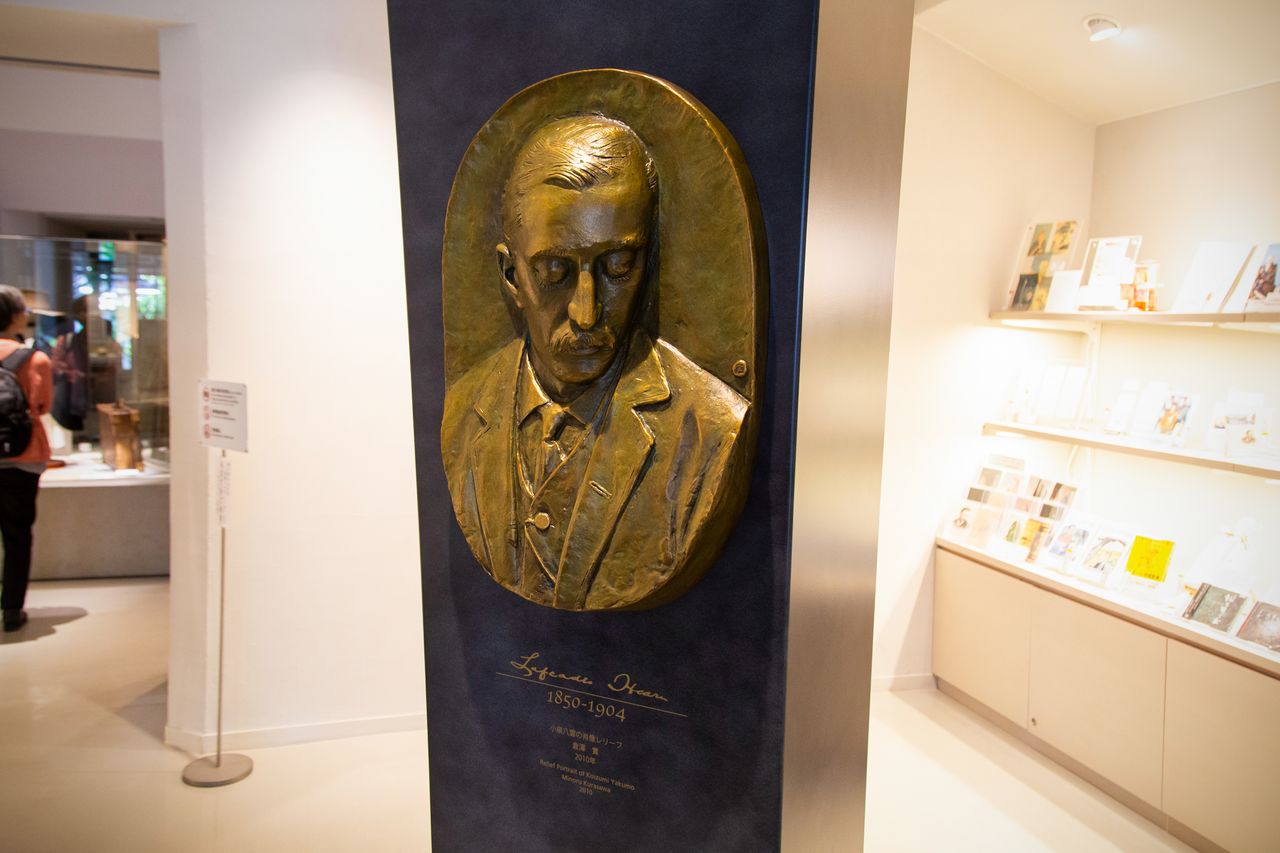 館内では八雲の肖像レリーフが出迎える。エントランスには、映像展示とミュージアムショップがある