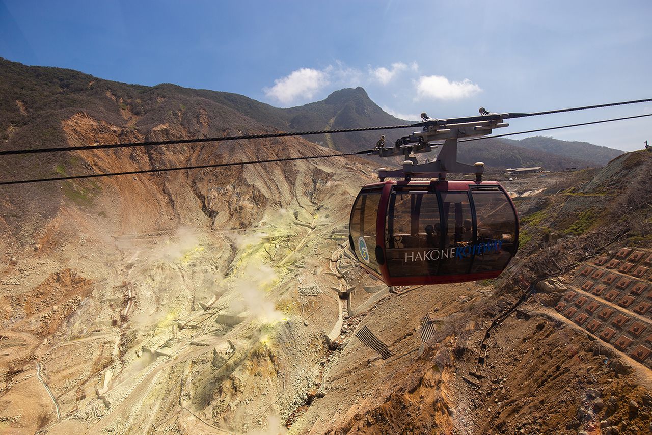 大涌谷駅と早雲山駅を結ぶルートは、「大涌沢」と呼ばれるエリアの上空を通過し、最大130メートルの高さから噴煙を上げる谷底を見下ろせる。噴気に火山ガスが混ざっているため、地面が黄色く変色している様子も確認することができ、地上からは決して味わうことのできない迫力あるパノラマが広がる。