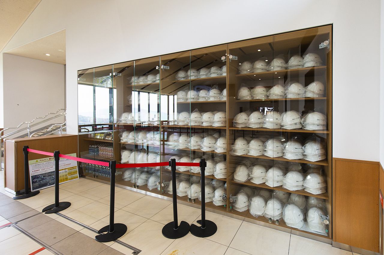 大涌谷駅は火山活動時に避難所の役割を担うため、大量の噴石対策用ヘルメットを備えている