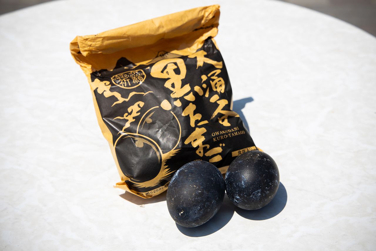 自然研究路の入り口から徒歩15分ほど、噴煙立ち上る場所に売店「玉子茶屋」がある。その傍らで、「1個食べると寿命が7年延びる」と言われる名物・黒たまごを作っている。黒たまごは約80度の温泉池で1時間ゆでた後、さらに100度の蒸気で15分蒸す。白い玉子が真っ黒になるのは、殻の表面にある無数の気孔に付着した温泉池の鉄分が硫化水素に反応し、黒い酸化鉄に変わるためだ。出来上がるとすぐに運搬用ロープウェイに積み込み、駅や駐車場近くの土産物屋へと運ぶ。
