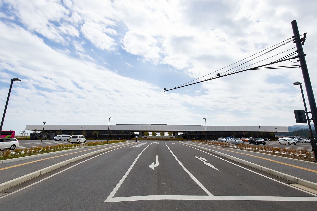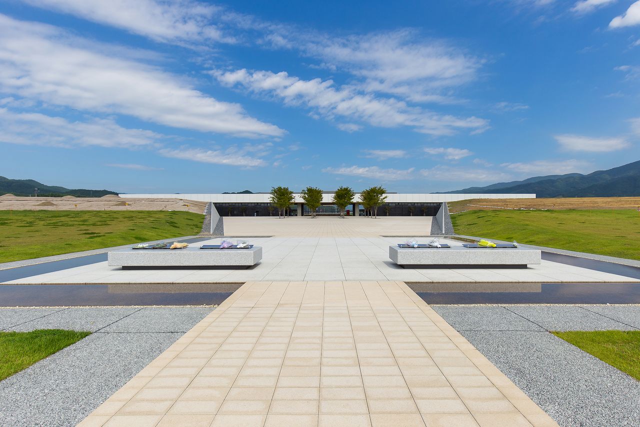 高田松原津波復興祈念公園の駐車場側から見た東日本大震災津波伝承館(建物左側)。右側には道の駅「高田松原」が入り、中央の通路を抜けると「追悼の広場」や海が望める献花台、奇跡の一本松へと続く