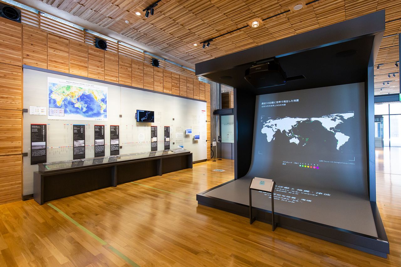 左は三陸地域の津波の年表と地層の展示。右のスクリーンでは、世界中で最近発生した地震の状況を把握できる