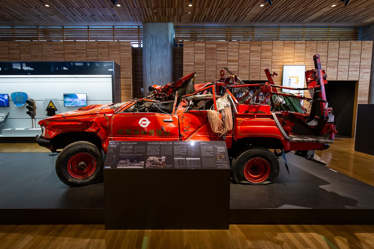 「事実を知る」コーナーには、被災現場の映像や写真、被災者の声に加え、津波の脅威を実感させる被災物が展示されている。ひん曲がったバス停や駅の看板、流失した橋桁の一部などの中で、ひときわ目を引くのが屋根のつぶれた消防車両だ。
