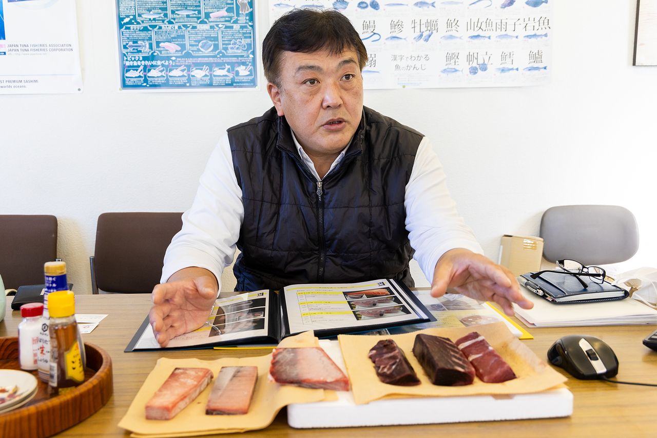 冷凍マグロの血合いを前に、今後の展望を語る青木社長。まぐろ未病改善効果研究会の副会長も務めている