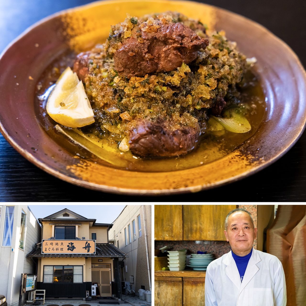 (上)ボリューム満点の「血合のステーキ エスカルゴ風」(左下)三崎港近くの人気店・海舟(右下)店主の草間一成さん