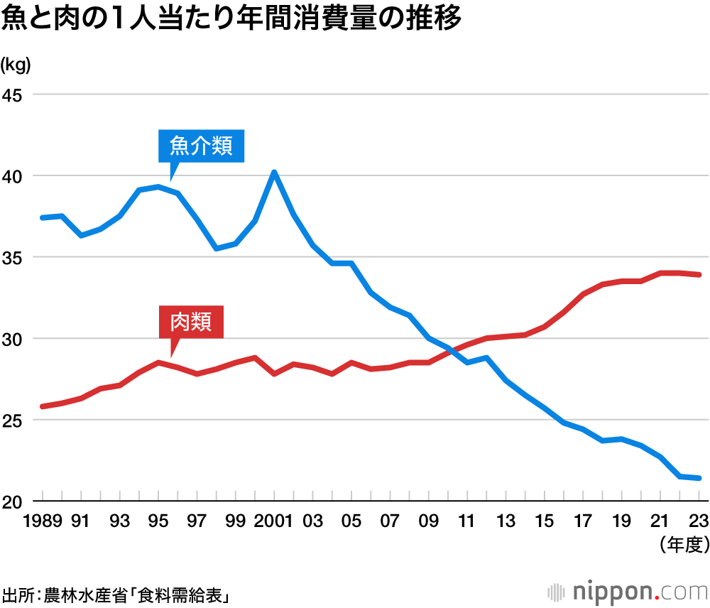 魚離れは決して近年、始まったことではない。農林水産省の食料需給表によると、魚介類の年間1人当たりの消費量は2001年の40.2キログラムをピークに減少に転じ、2023年度は21.4キログラムとほぼ半減。およそ50年前の水準まで落ち込んだ。