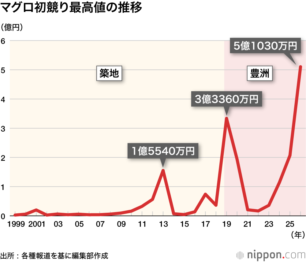 初競り一番マグロは、築地市場時代の2000年まで1000万円に満たなかった。21世紀初というご祝儀相場だった2001年に2020万円を記録したものの、しばらく目立った高値はなかったが、2010年代に入って上昇。13年には222キロが1億5540万円(キロ70万円)と初めて億の大台に乗った。この時に落札したのも喜代村で、木村社長の両手を広げたポーズ、「マグロ大王」の異名は国内外で知られるようになる。