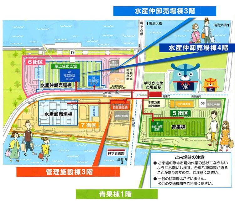 飲食・物販店があるのは、「青果棟」(5街区)、「水産仲卸売場棟」(6街区)、「管理施設棟」(7街区)の3つの建物。また、野菜や果物を扱う「青果棟」、水産物を扱う「水産卸売場棟」(7街区)には市場の見学コースあり。この地図は、ゆりかもめ「市場前駅」などでもらえるので、まず入手しよう。