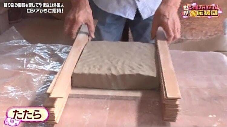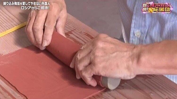 初めてたたらを見たアレクサンドラさんは「たたらがあるのはすごく便利ですね。ロシアに帰ったらすぐに作ります」と熱心にメモ。続いて水野さんは、焼くと白くなる粘土と茶色くなる粘土、その中間色の粘土の3種類を準備。丸い棒状にこねた別の粘土に、接着面に刷毛で水を塗り、先程の3色の粘土を巻きつけていきます。