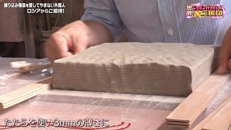 いよいよ工房で水野さんの技を見せて頂くことに。まず取り出したのは瀬戸産の粘土。「菊練り」という独特の練り方で粘土の中の空気の粒を抜きます。練り方が甘いと、焼いた時に中の空気が膨張し、壊れる原因になるそう。練った粘土を平たい板状にしたところで、アレクサンドラさんに硬さを確認してもらいます。「この感触を忘れないようにします」水野さんが教えて下さることをすべて吸収しようとするアレクサンドラさん。次に水野さんが取り出したのはたくさんの薄い板。「これを瀬戸では"たたら"と言います」。