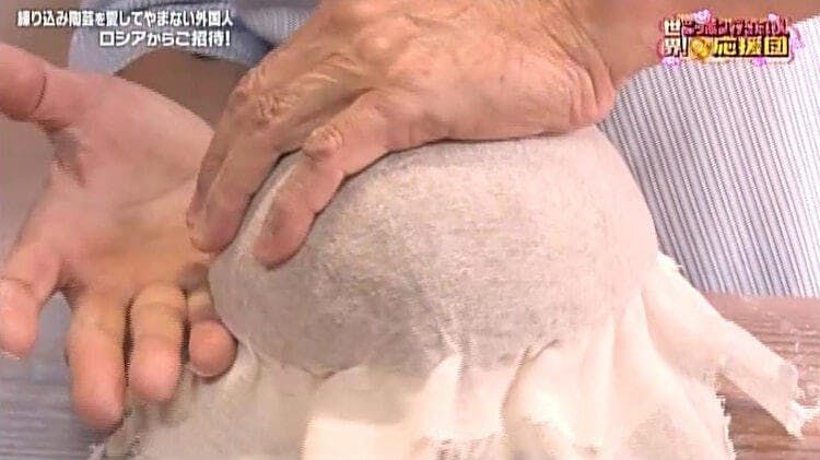 練り込みならではの、1つ1つ味わいがある独特の花模様。これをお椀に成型していきます。水野さんはアレクサンドラさんが参考にしやすいようにと、今回は型を使う方法を教えてくれました。厚さ7.5ミリにカットして、表面が汚れないようにガーゼで挟んで型にのせ、ろくろを回転させながら形を整えます。つなぎ目の部分が開かないように丁寧で手でおさえるのがポイント。