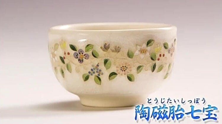 陶磁胎七宝とは江戸時代から明治初期まで日本で作られていたもので、幅わずか1ミリの純銀のリボンをピンセットで曲げて模様を作り、色のついた釉薬を流し込むという七宝焼きの一種。今は失われてしまった作り方なので、「幻の七宝」と呼ばれているそう。