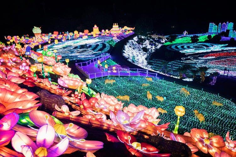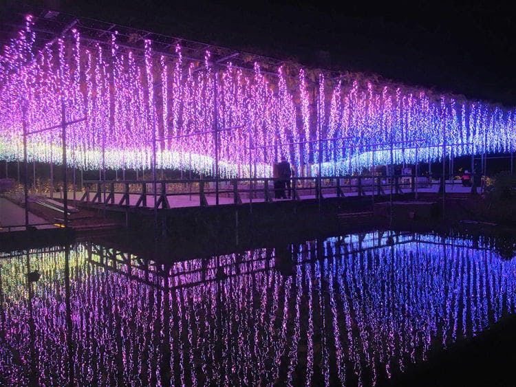 日本三大イルミネーションの1つ。94,000㎡の広大な園内に500万球を超えるイルミネーションを装飾。新作イルミネーション「光のふじのはな物語」は、1本の幹で4色の藤の色が移り変わっていく、イルミネーションだからこそ表現できる美しさ。水面に映りこむ幻想的な姿も楽しめます。