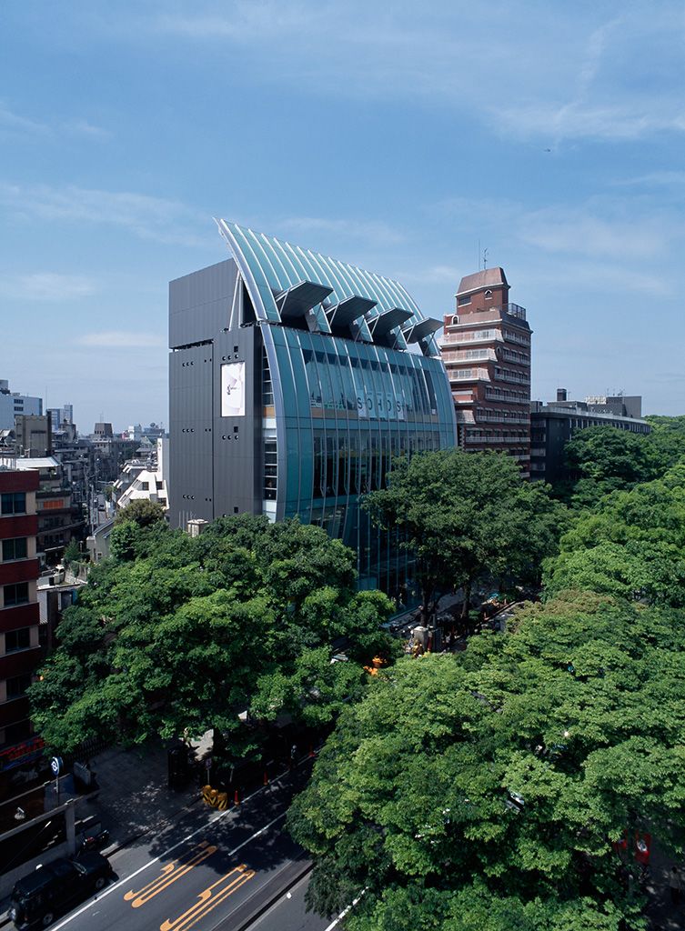ファッションを中心とした若者文化の発信地、原宿の表参道側にあるビル。スペイン発のブランド「ZARA」やスポーツジムなどが入る。表参道に面して大胆に弧を描くガラス張りのファサードが特徴だ。しかし通りからは圧迫感はなく、エメラルドグリーンのガラス面は街路樹の緑に溶け込むようである。LED照明がいち早く採用されたビルであり、ファサードに仕込まれたライトによって夜は紫の明かりをまとい、妖艶(ようえん)な表情を醸しだす。