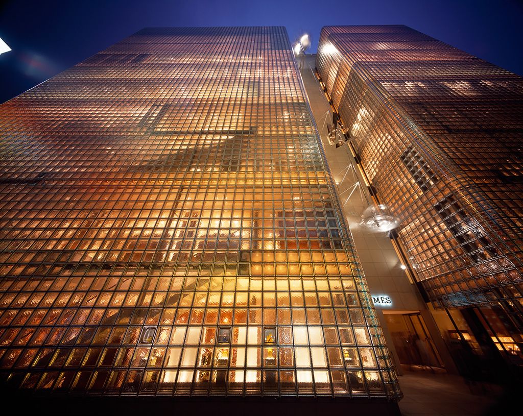 銀座の晴海通りに面して建つ、エルメスの旗艦店。ショップやオフィスのほか、ミュージアムやイベントスペースを擁する。最大の特徴は「マジック・ランタン」と呼ばれる全面ガラスブロックのファサード。外装全面はイタリアで製作された45cm角の大きなガラスブロック13000個で覆われている。日中は万華鏡のように店内を映し、夜はランタンのように建物全体が発光する。地震の衝撃を受け流す自律的な制振構造システムが採用されていることも特徴。