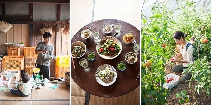 次男の仁史君はパパといつも一緒(写真左)。毎朝のちゃぶ台には、畑で採れた野菜を使った久美子さんの手料理が並ぶ(中央)。収穫する久美子さんの背中にはいつも仁史君が(右)