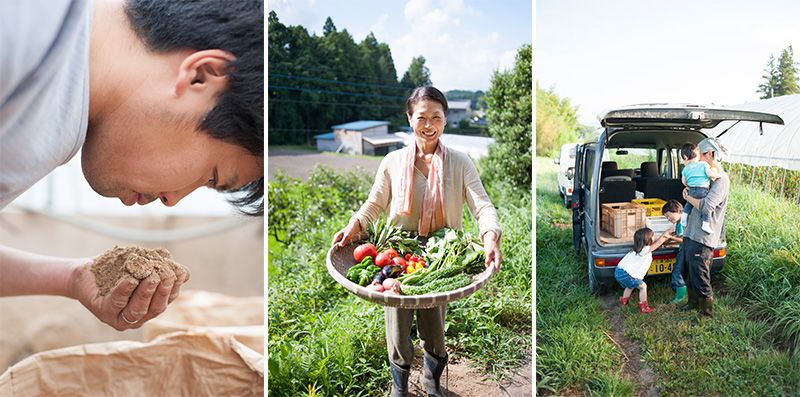 良質な土からしかおいしい野菜は生まれない(写真左)。採れたての新鮮な野菜(中央)。畑仕事の合間のひと時(右)