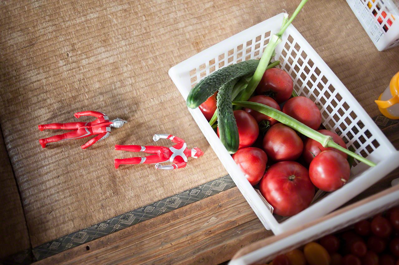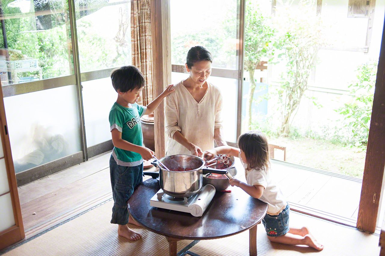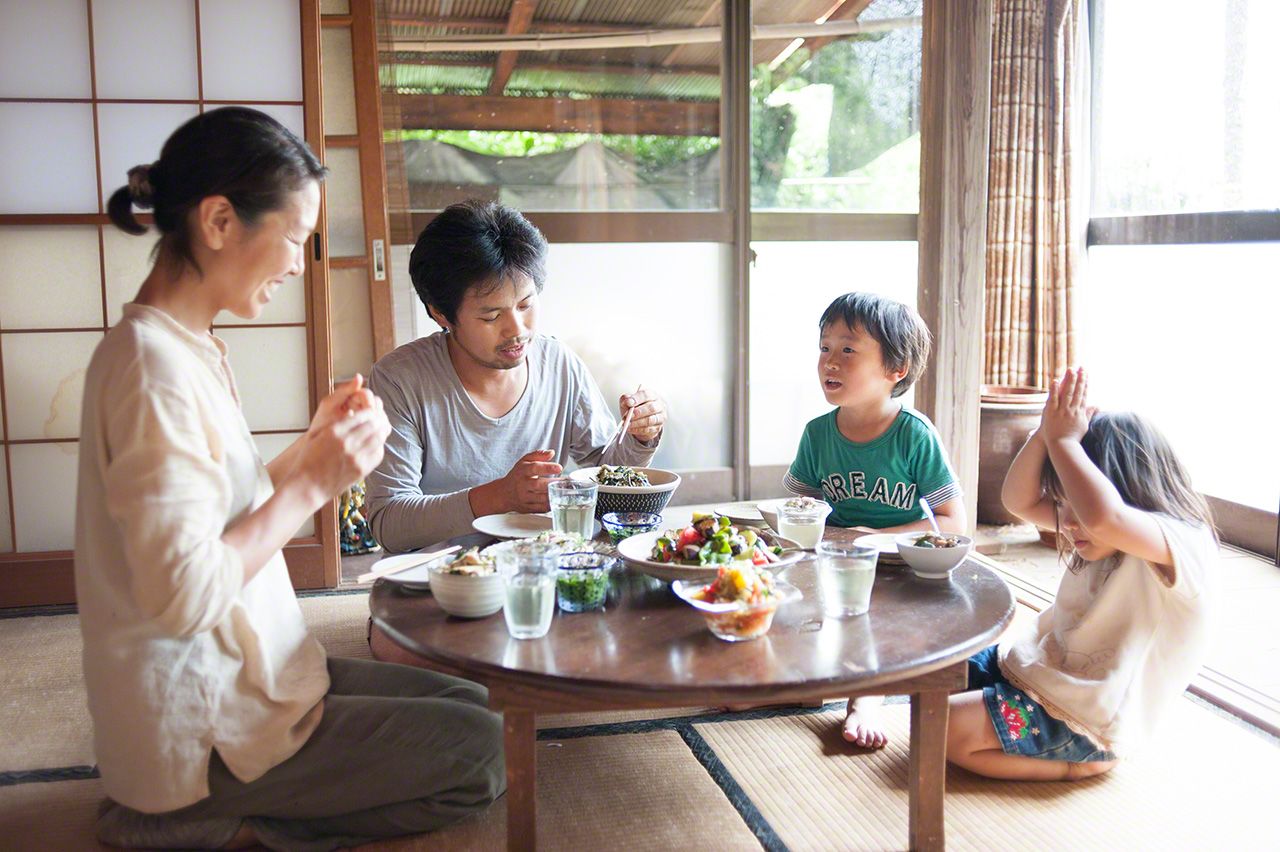 夕方に田中家の食卓をのぞいてみると、久美子さんはレストランで修業した腕を振るって庸介さんが育てた野菜を料理していた。古民家の台所を改装した小さなキッチンで、手際よく料理が出来上がっていく。子供たちも、収穫したばかりのトマトをトマトピューレにするなどで参加。その合間にお絵かきも忘れない。料理が出来上がると、ちゃぶ台に次々と並んでゆく。料理がそろうと、家族みんなでちゃぶ台を囲み、手を合わせて「いただきます!」。豪華な料理が並ぶわけではないが、自分たちで育てた大地の恵みを食べる——とても贅沢(ぜいたく)な食卓だ。