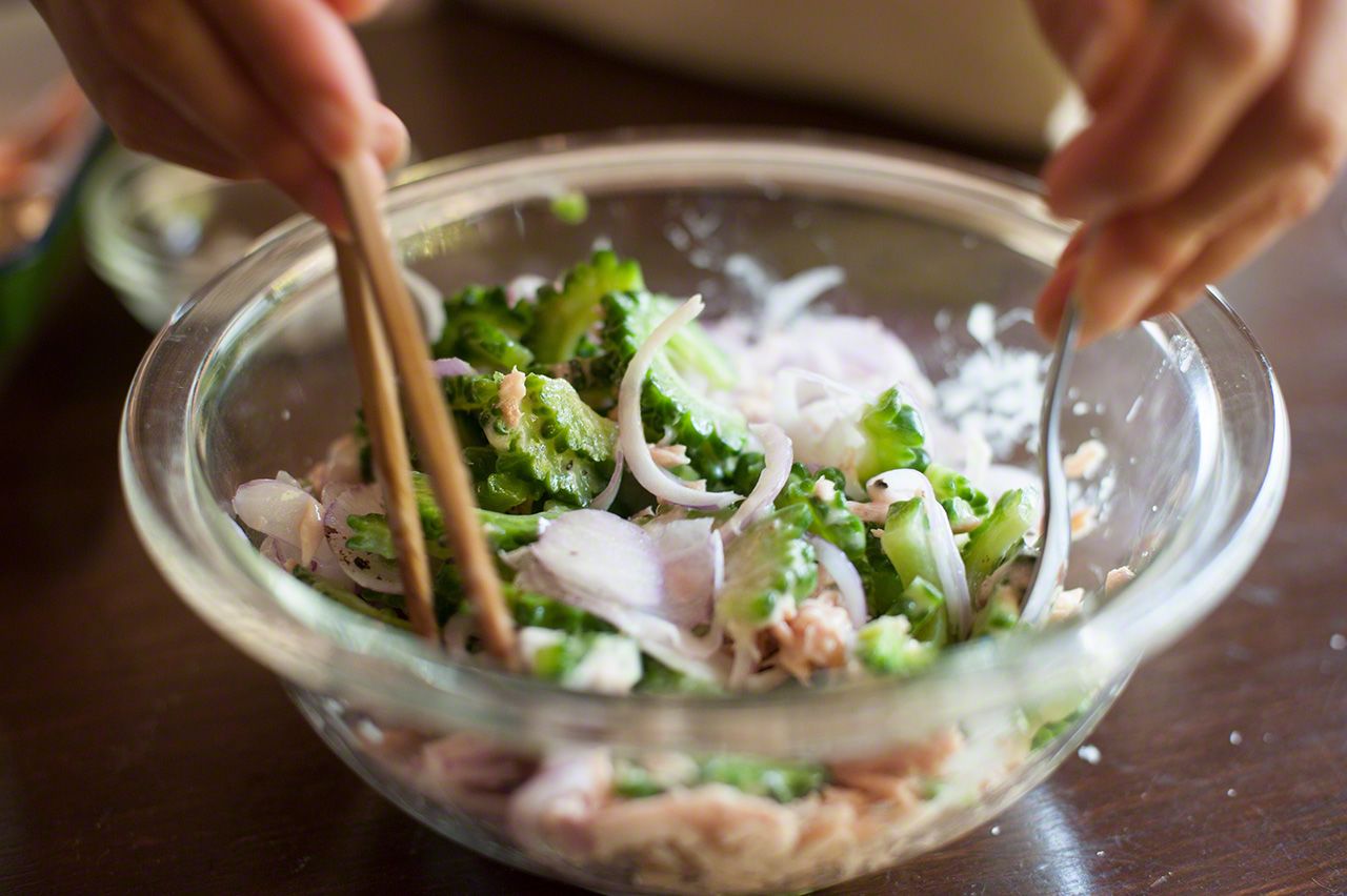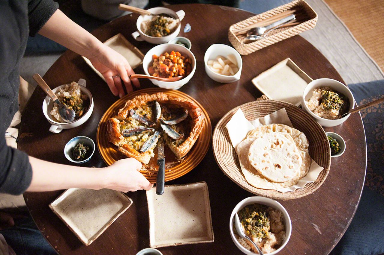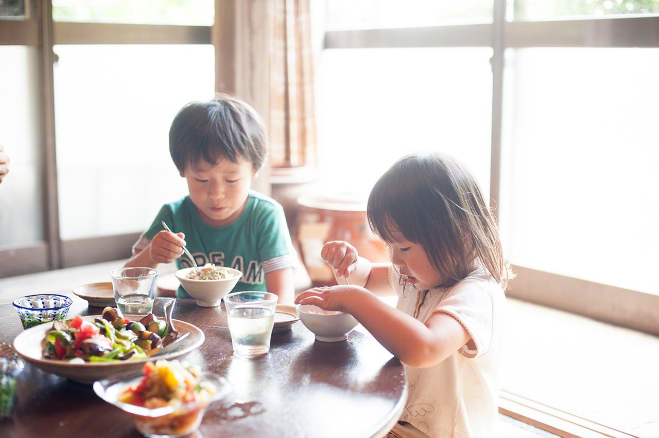 夕方に田中家の食卓をのぞいてみると、久美子さんはレストランで修業した腕を振るって庸介さんが育てた野菜を料理していた。古民家の台所を改装した小さなキッチンで、手際よく料理が出来上がっていく。子供たちも、収穫したばかりのトマトをトマトピューレにするなどで参加。その合間にお絵かきも忘れない。料理が出来上がると、ちゃぶ台に次々と並んでゆく。料理がそろうと、家族みんなでちゃぶ台を囲み、手を合わせて「いただきます!」。豪華な料理が並ぶわけではないが、自分たちで育てた大地の恵みを食べる——とても贅沢(ぜいたく)な食卓だ。