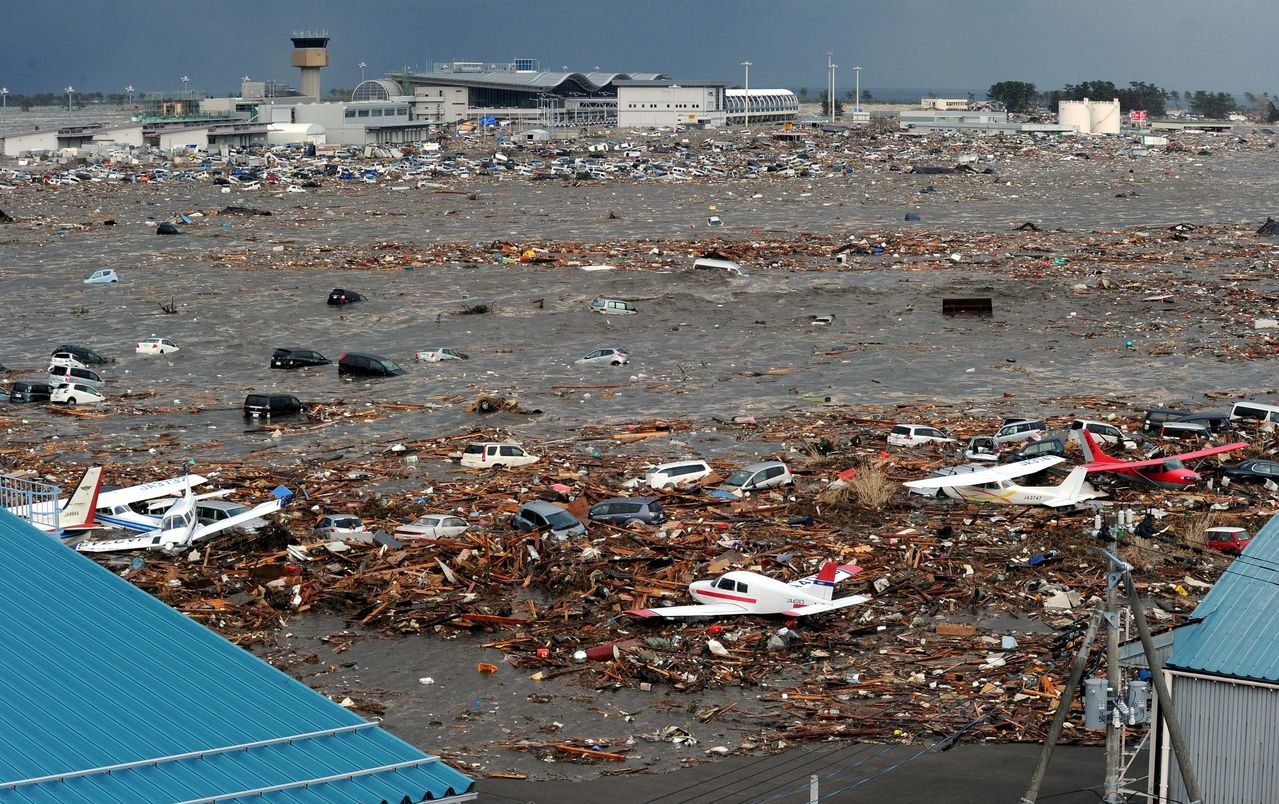 3月11日 午後4時ごろ 宮城県岩沼市滑走路に津波が押し寄せた仙台空港。無数の車や粉砕された家屋。小型機も流され、一面残骸の海原となった。写真奥は旅客ターミナル。4月13日、国内線の運航再開。