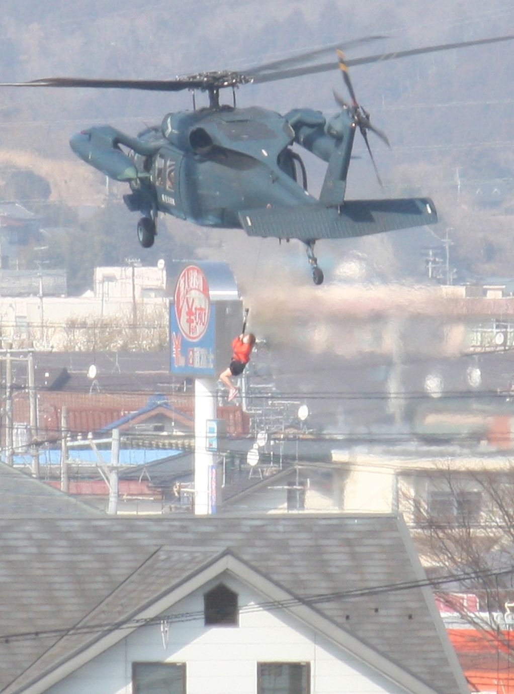 3月13日 午後2時ごろ 宮城県石巻市中里自衛隊のヘリコプターで救出される被災者。