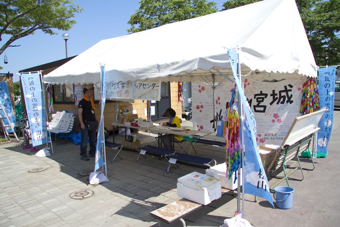 総合体育館の近くに設置されたボランティア事務所の周りも、閑散としていた。若者を中心とする男女数人が、和やかな雰囲気でおしゃべりを楽しんでいる様子である。