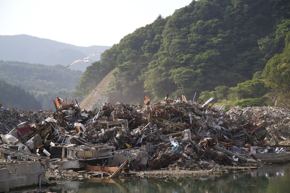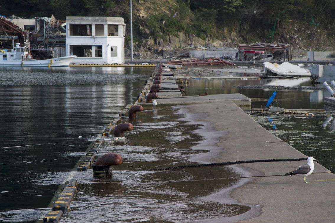 海岸部に下りると、波がひたひたと打ち寄せるひび割れた港や鉄筋コンクリートの廃墟が放置されたままだ。山のようにうず高く積まれていた瓦礫だけはかなり減っている。それでも、人の気配がほとんどない。魚介類の腐臭が漂う中、黒々としたハエの群れが飛び交うばかりだ。