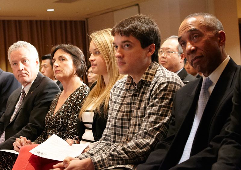 「夢を生きる」上映会でのアンダーソン家。左からテイラー・アンダーソンさんの父アンディさん、母ジーンさん、妹ジュルズさん、弟ジェフリーさん。右端はこの映画を監督したレジー・ライフさん。(2013年3月8日、都内のホテルで/撮影=花井智子)