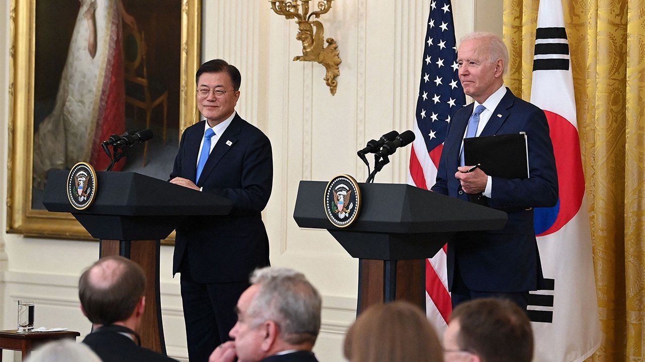バナー写真:ホワイトハウスでの首脳会談後、記者会見に臨む韓国の文在寅大統領(左)とバイデン米大統領=2021年5月21日、米ワシントン(AFP=時事)