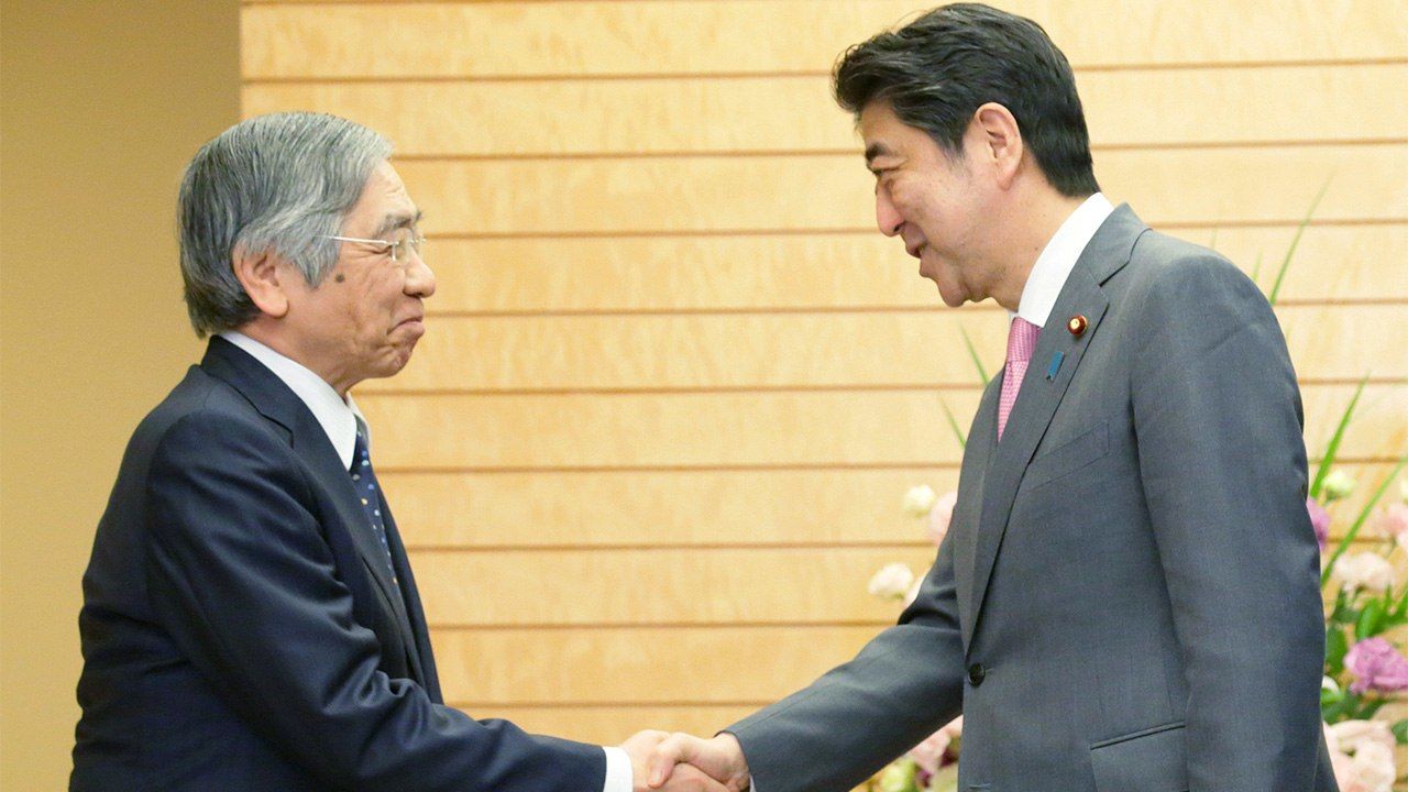 バナー写真:再任された日本銀行の黒田東彦総裁(左)と握手する安倍晋三首相(当時)=2018年4月9日、首相官邸(時事)