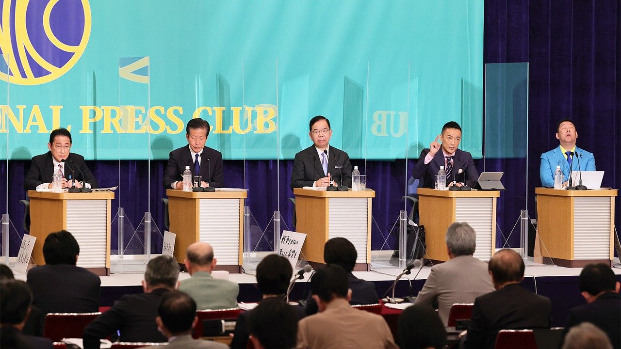 バナー写真:2022年の参院選で日本記者クラブ主催の討論会に臨む、左から岸田文雄首相(自民党総裁)、公明党の山口那津男代表、共産党の志位和夫委員長、れいわ新選組の山本太郎代表、NHK党の立花孝志党首=2022年6月21日、東京都千代田区(時事)