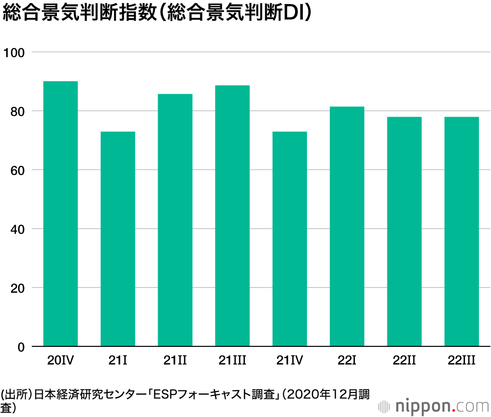 ESPフォーキャスト調査における、フォーキャスター全員の総意を示す「総合景気判断指数」を見ると、20年10~12月期は景気判断の分岐点に当たる50を大幅に上回る90.0だった。その後22年7~9月期までは70~80台で50を大幅に上回って推移するが、「総合景気判断指数」が一時的に低めになるのは、21年1~3月期と五輪・パラリンピック終了直後の21年10~12月期で、どちらも72.9である。多少の波があるものの、おそらく20年5月を谷とする、緩やかな景気回復が続くというのがエコノミストのコンセンサスとなっている。