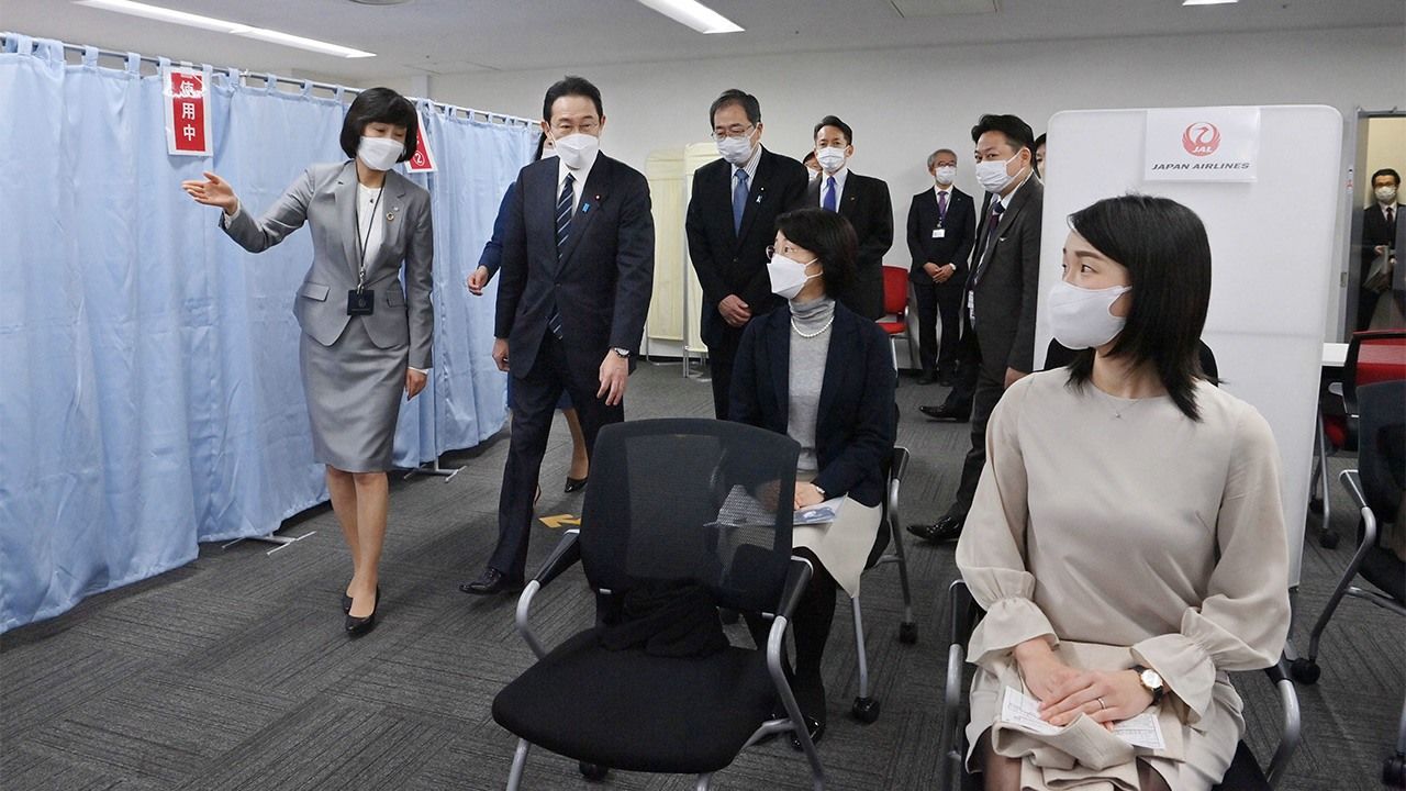 バナー写真:航空業界が行っている新型コロナウイルスワクチンの職域接種を視察する岸田文雄首相(左から2人目)=2月12日に羽田空港で。代表撮影、時事=