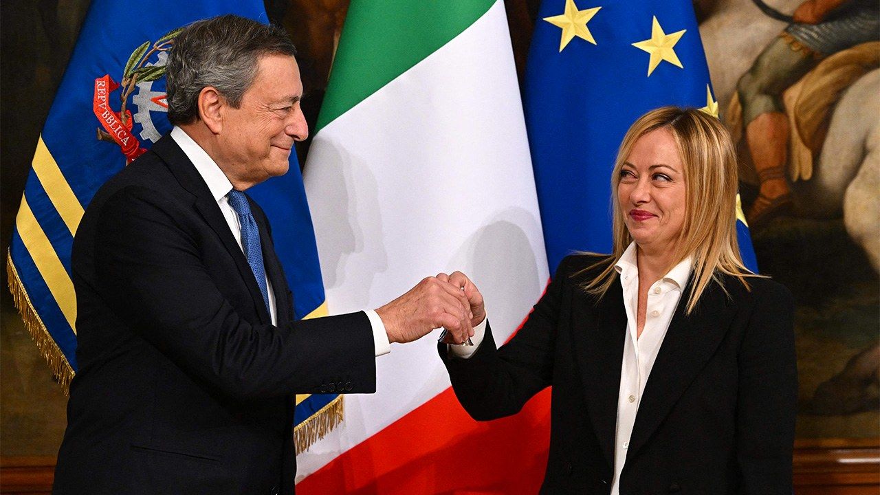 バナー写真:ドラギ前首相(左)との政権引き継ぎ式に臨み、閣議で使う「鈴」を手渡されるイタリアのメローニ新首相=2022年10月23日、ローマ(AFP=時事)