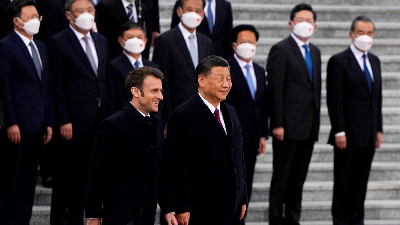 バナー写真:中国を訪問し、北京で歓迎式典に臨むフランスのマクロン大統領(左)。右は習近平国家主席=2023年4月6日(AFP=時事)