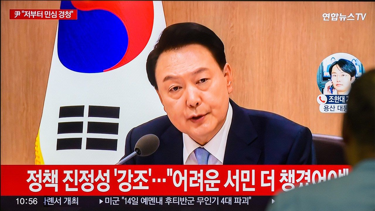 バナー写真:韓国総選挙後4月16日の閣議に出席した尹錫悦大統領を映し出したテレビ画面。尹大統領はこの場で、選挙の結果を謙虚に受け止め、国民との意思疎通に努めると述べた(Kim Jae-Hwan / SOPA Images via Reuters Connect)