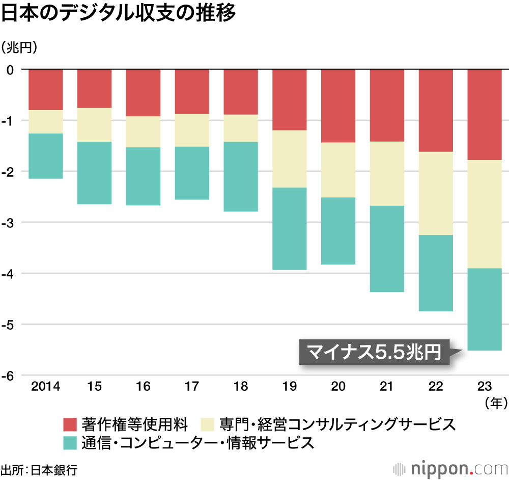日本銀行が発表する国際収支統計によると、デジタルサービスの収支は悪化する一方だ。赤字は2014年の2.1兆円から23年には5.5兆円となった。デジタルサービスとは、「著作権などの使用料」、「専門・経営コンサルティング」、「通信・コンピューター・情報サービス」の3つを合計したもの。3つ目の赤字は、クラウドサービスに加えて、OSなどソフトウエアのライセンス費用の増加などによるもので、シンクタンク三菱総合研究所(MRI)の研究員は「日本が(デジタルサービスの)競争に負けたからだ」と指摘している。